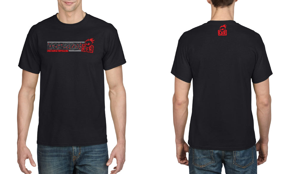 A comfortable, black Gildan T-Shirt featuring our new Raven graphic in red courtesy of Barrett Hepburn Design.
